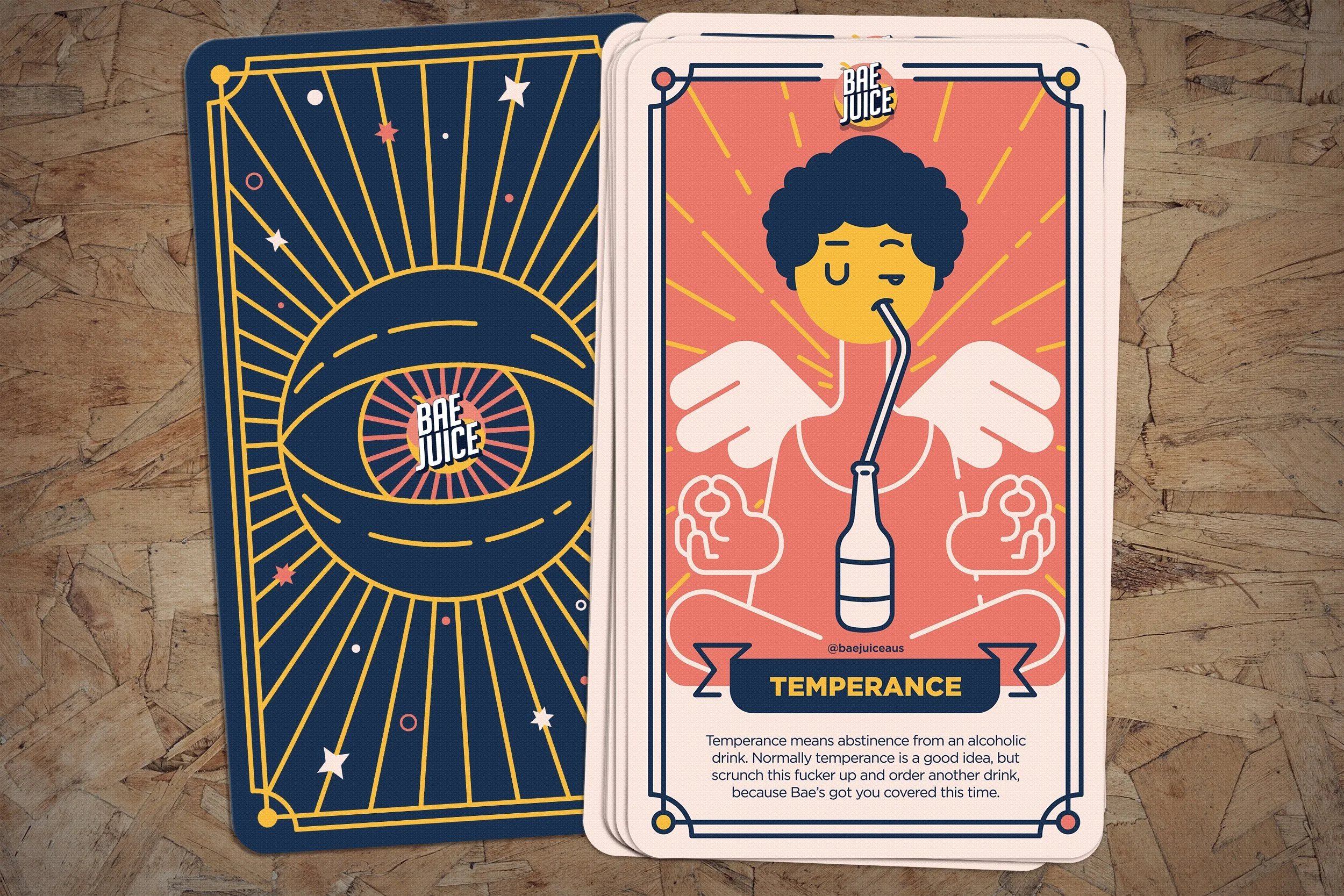 Bae Juice is a pre-getting-drunk hangover cure that you suck down before getting stuck in. So when they were the main sponsor for a festival afterparty with lots of people who weren’t acquainted, we created a bunch of tarot-style cards that used their playful tone of voice to bring people a little closer and know Bae Juice was going to be their saving grace in the morning.